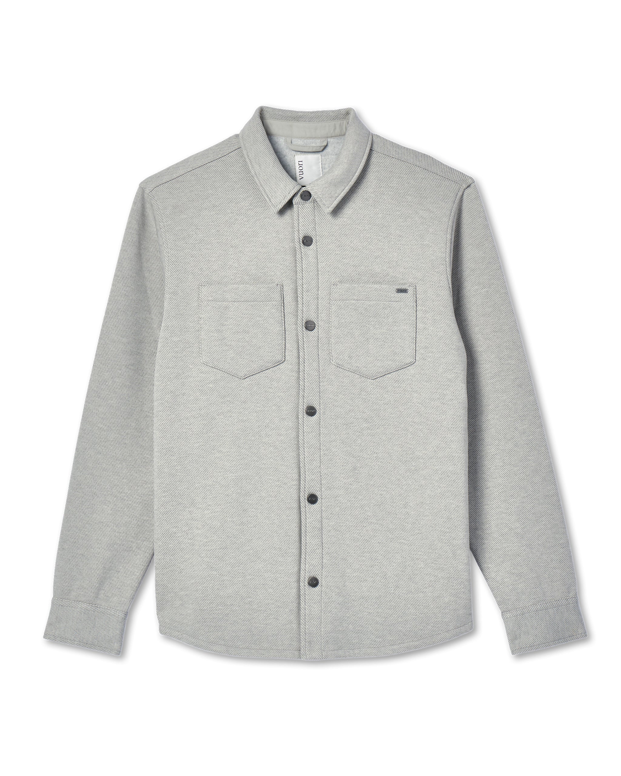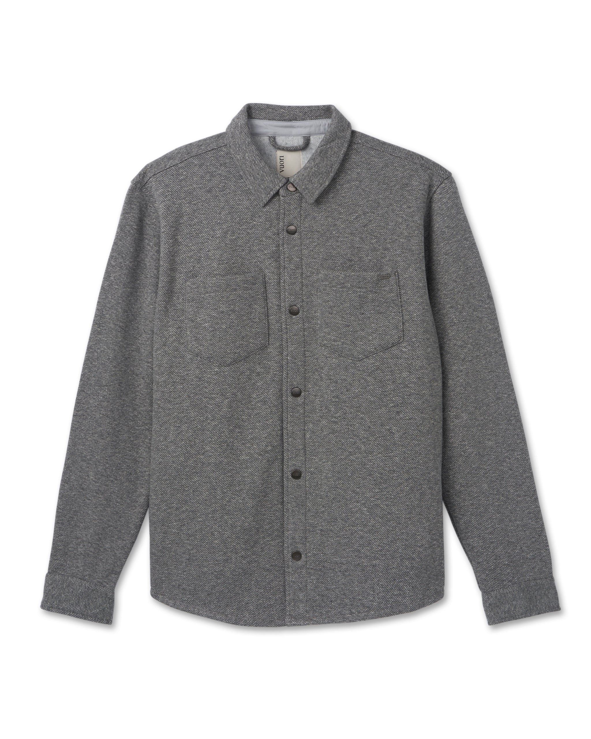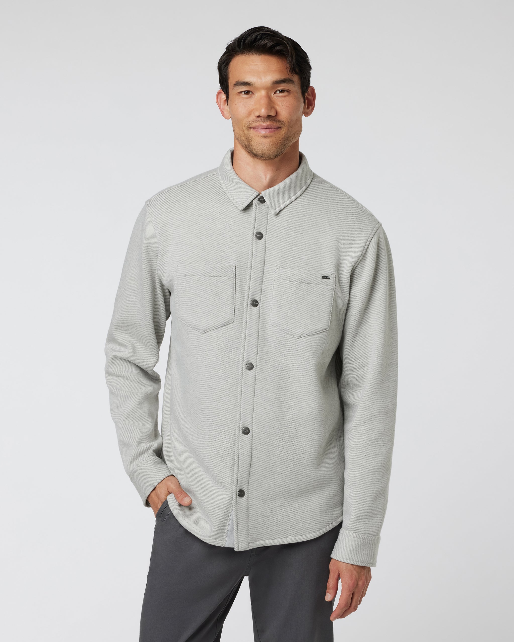 Featuring a soft heather twill fleece outer and brushed interior, this is a warm and cozy jacket—ideal for layering. Finished with chest pockets and a full button closure.
