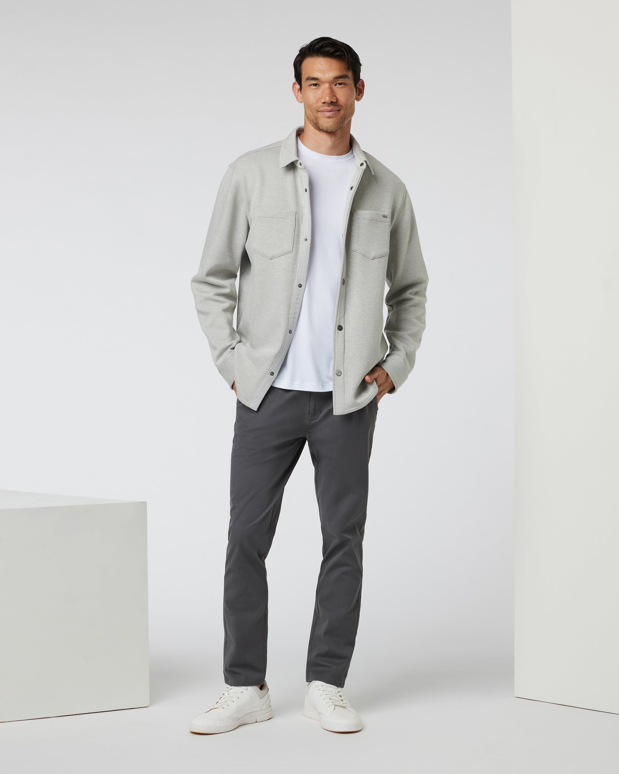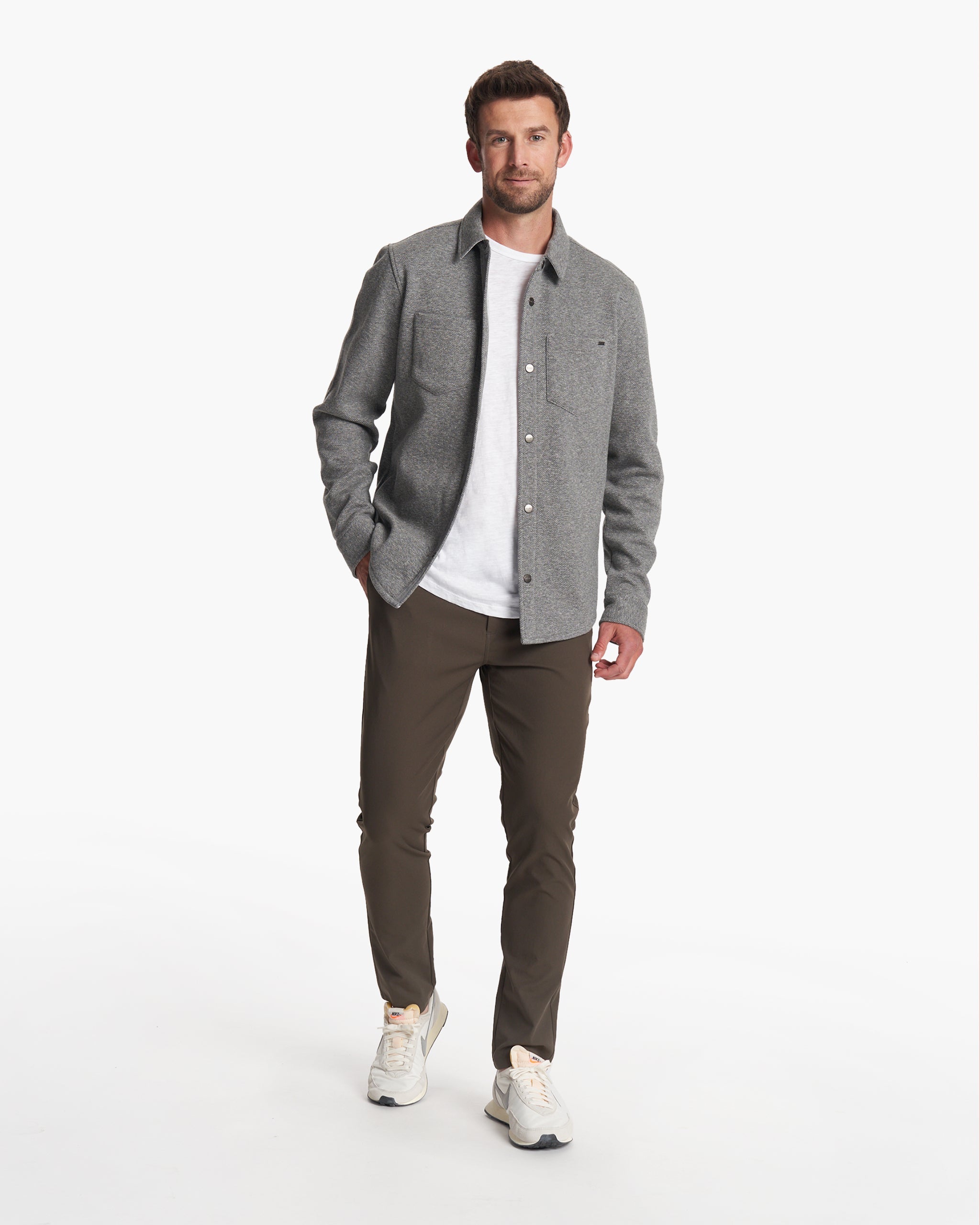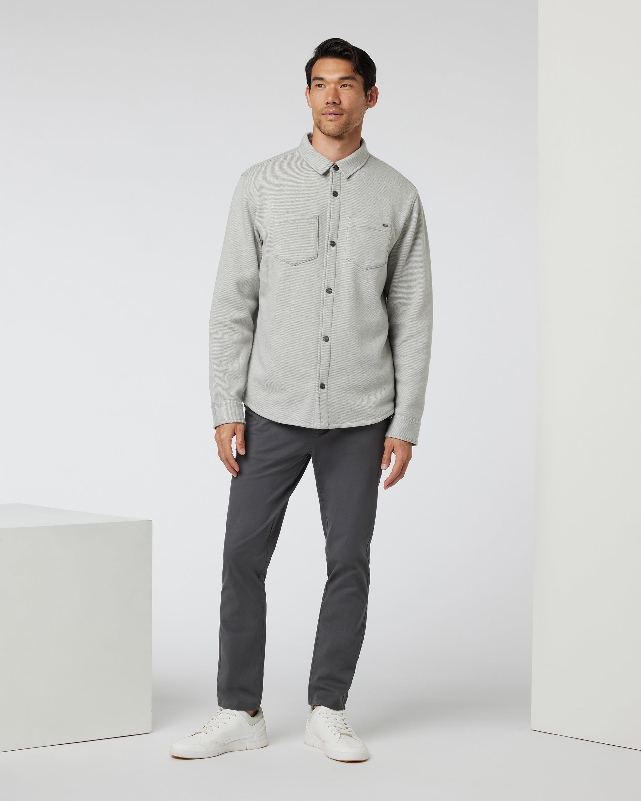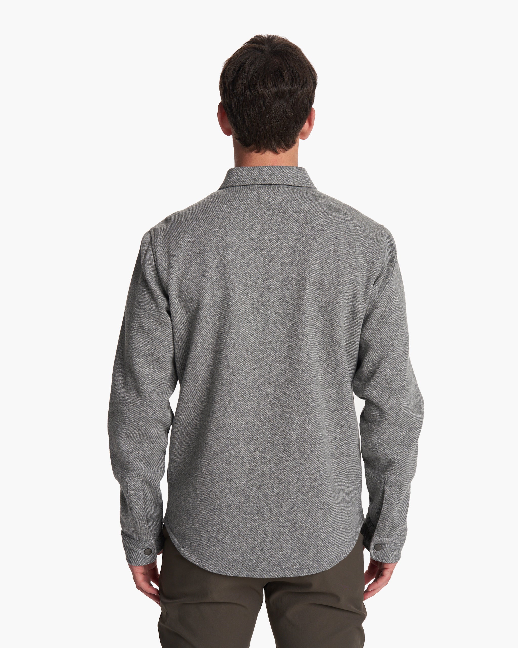 Featuring a soft heather twill fleece outer and brushed interior, this is a warm and cozy jacket—ideal for layering. Finished with chest pockets and a full button closure.