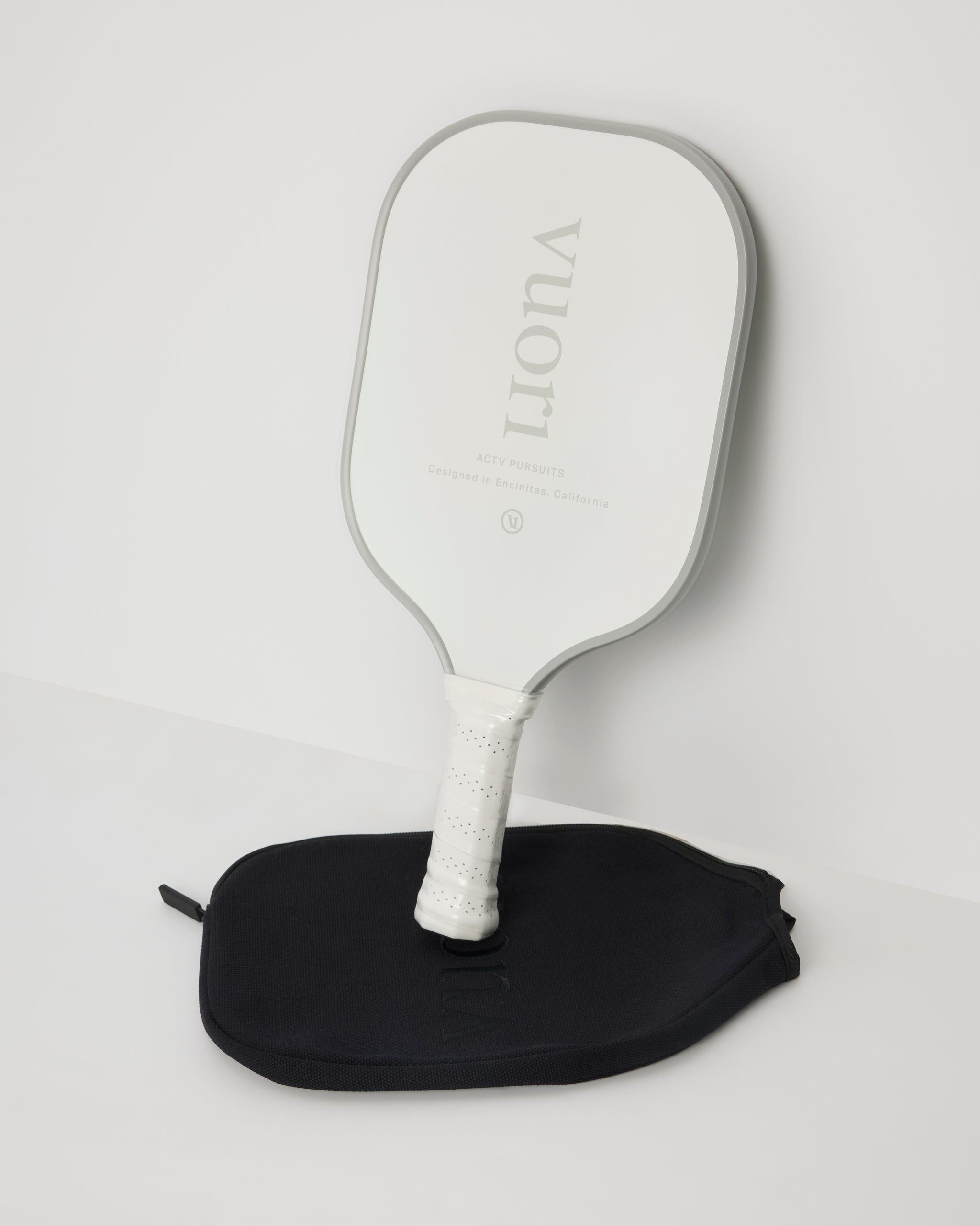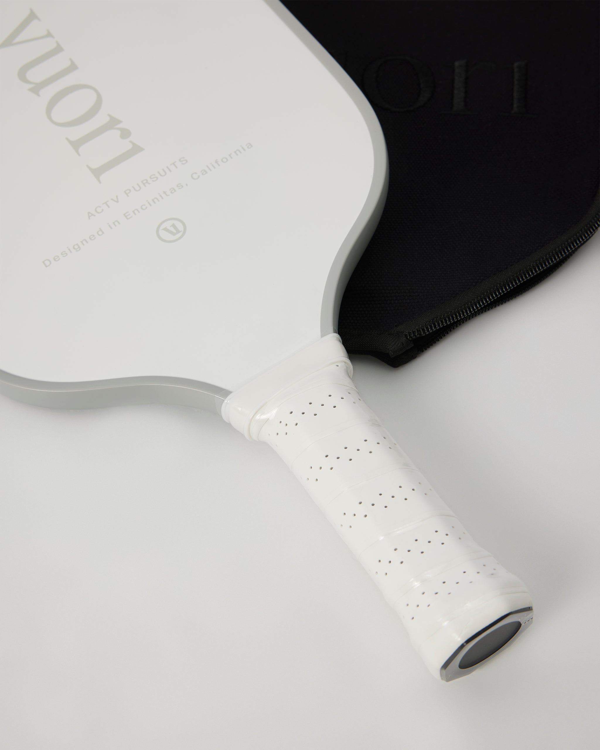 A regulation pickleball paddle crafted from lightweight carbon fiber. It has a polypropylene core and soft comfort grip for better handling. Comes with an embroidered cotton canvas cover.